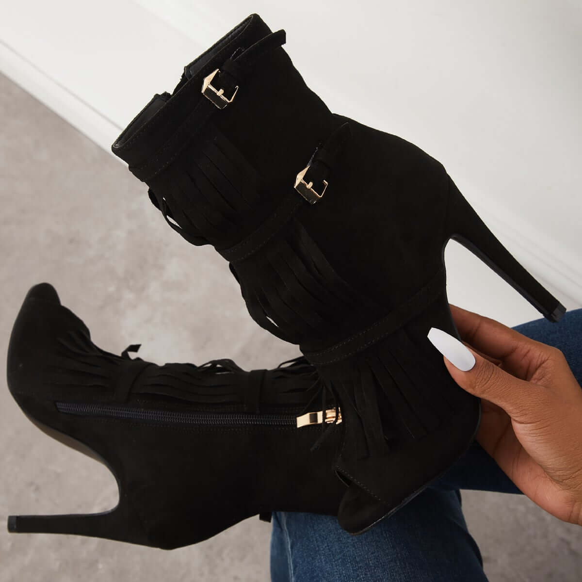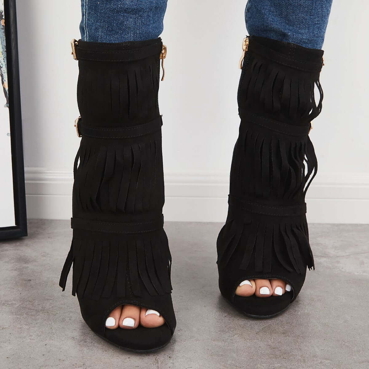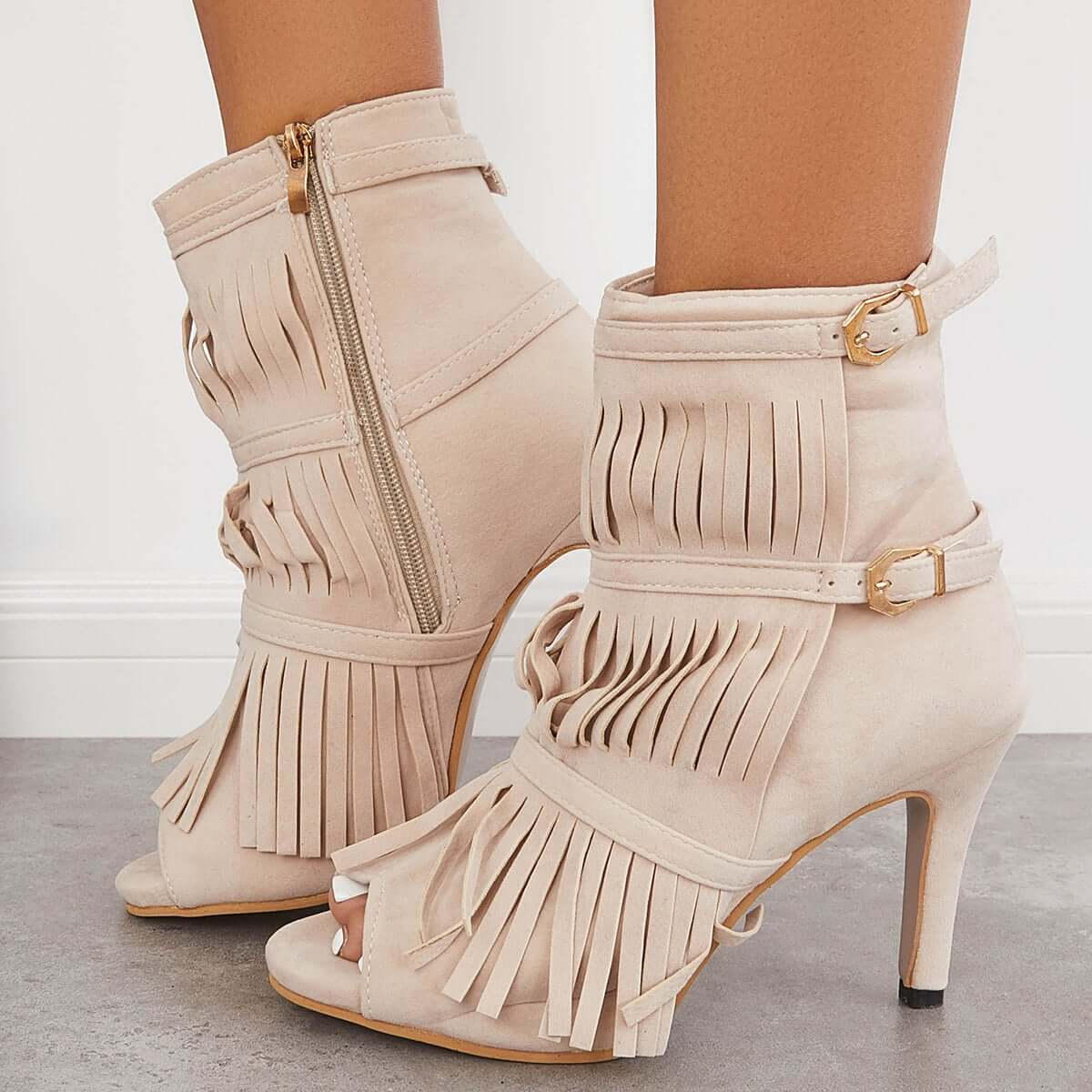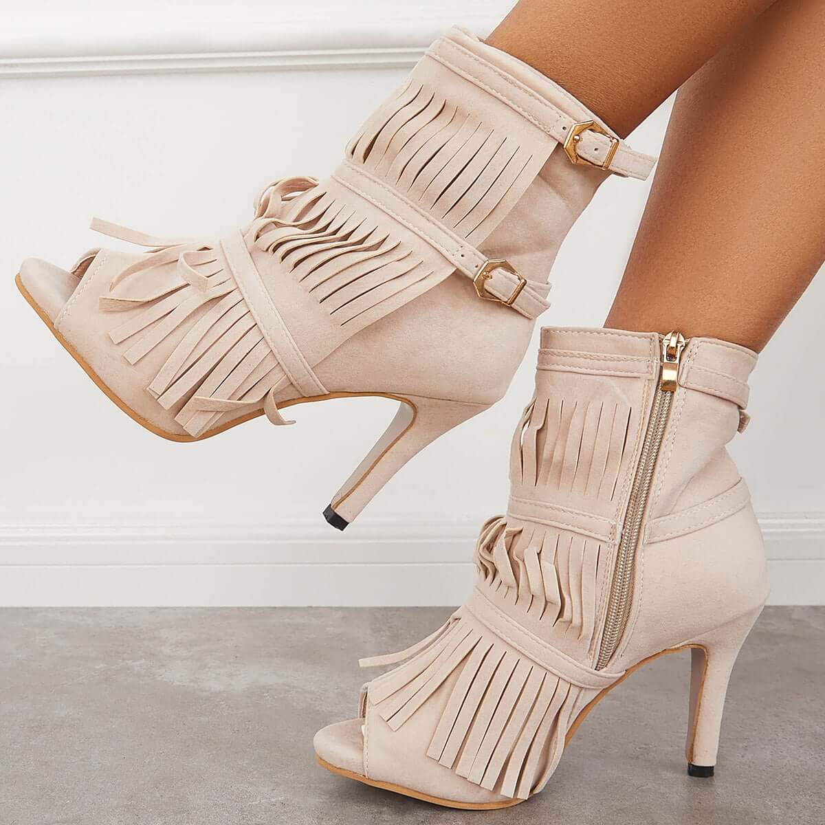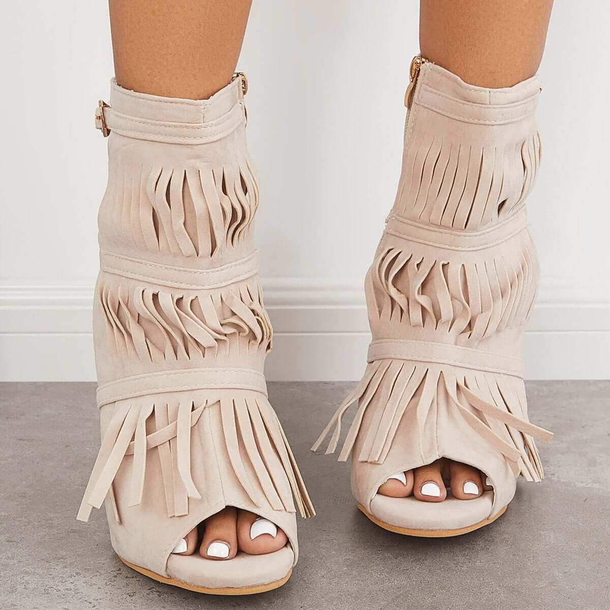 • Fashion Fringe Peep Toe Stilettos High Heels Ankle Boots