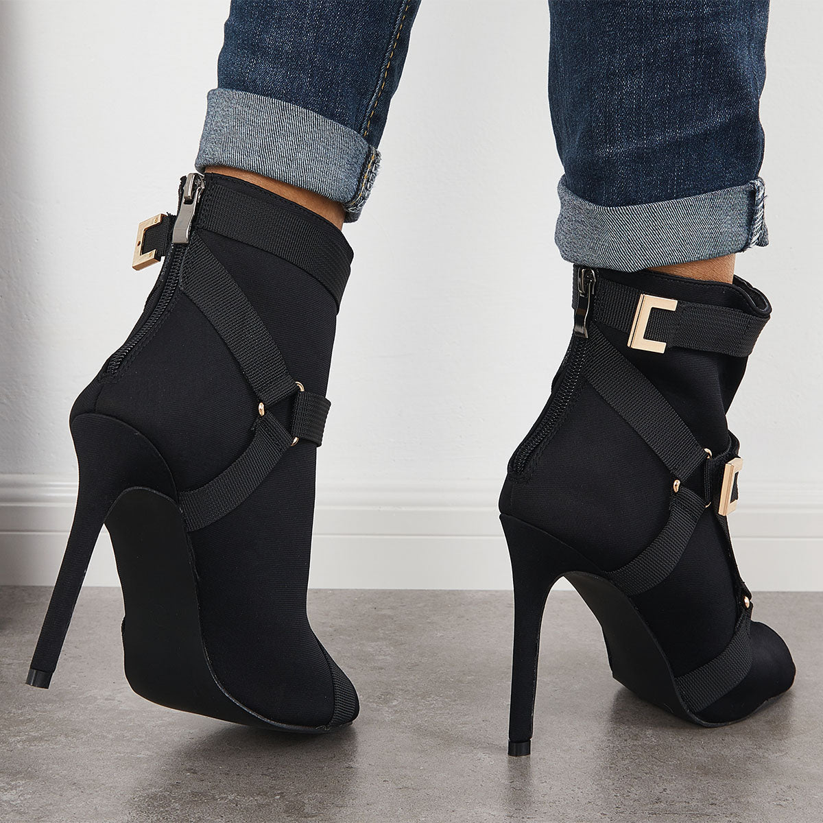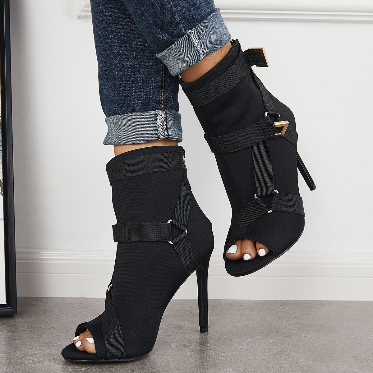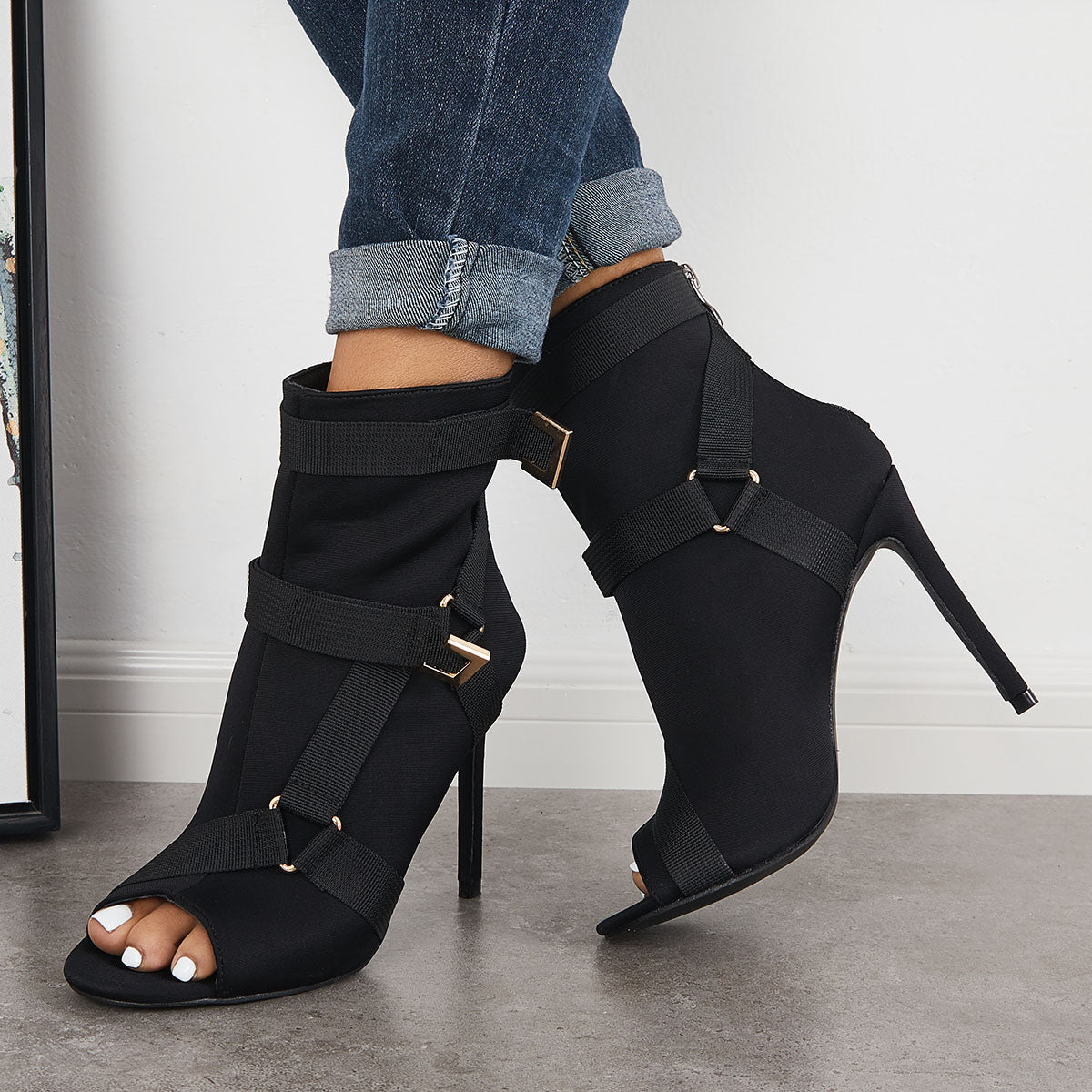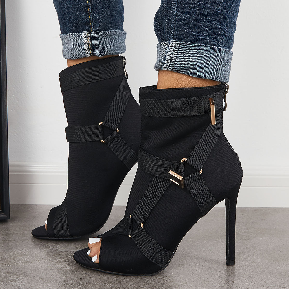 • Peep Toe Stiletto High Heels Back Zipper Ankle Boots